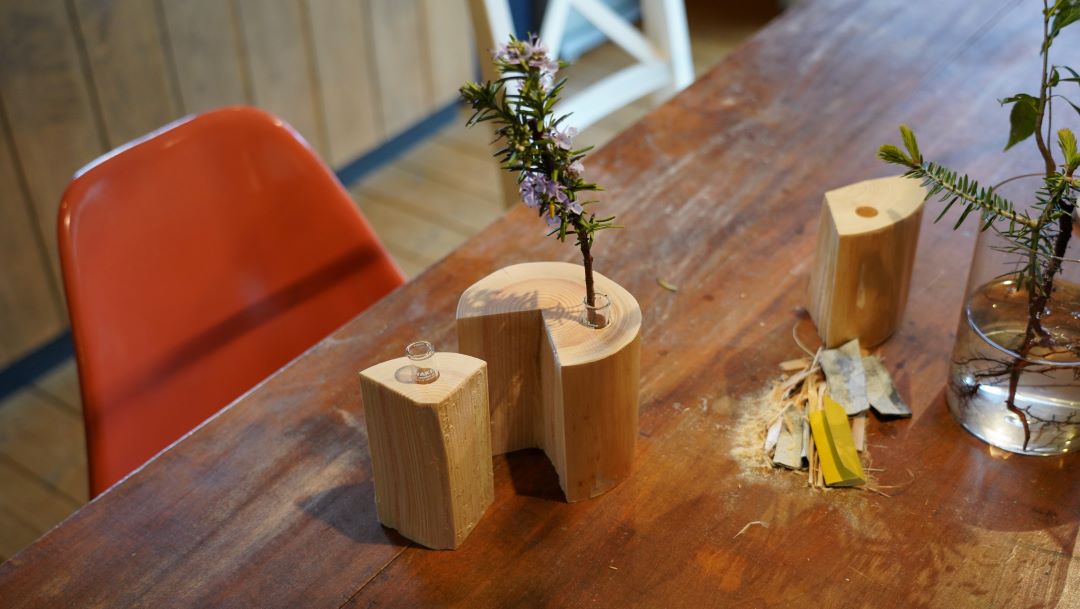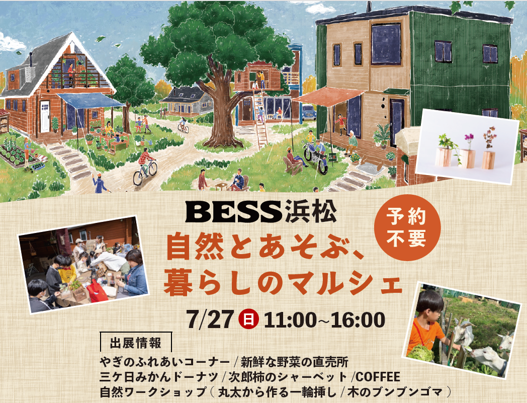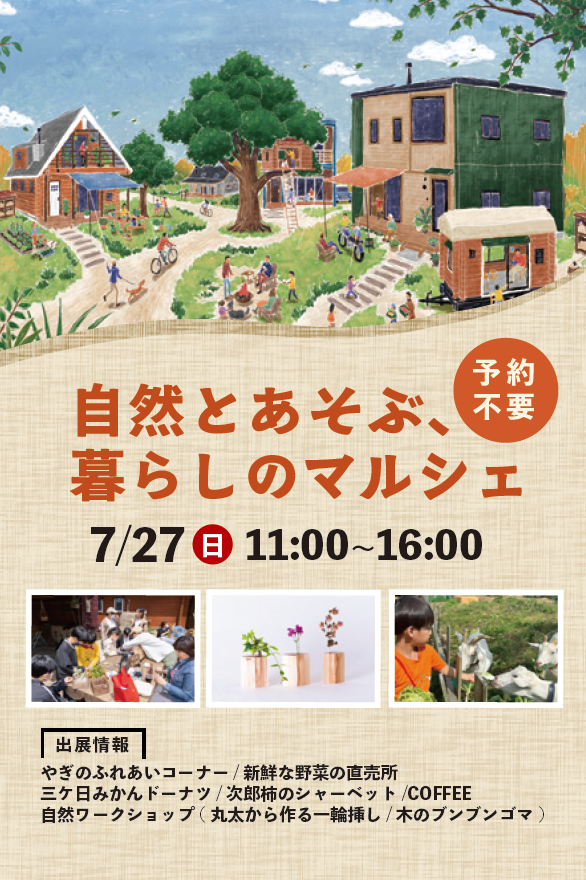 丸太を使った一輪挿しや木のブンブンゴマをつくる自然クラフト体験をはじめ、 やぎとのふれあい、新鮮な野菜の直売、キッチンカーも楽しめる「自然とあそぶ、暮らしのマルシェ」を開催します。