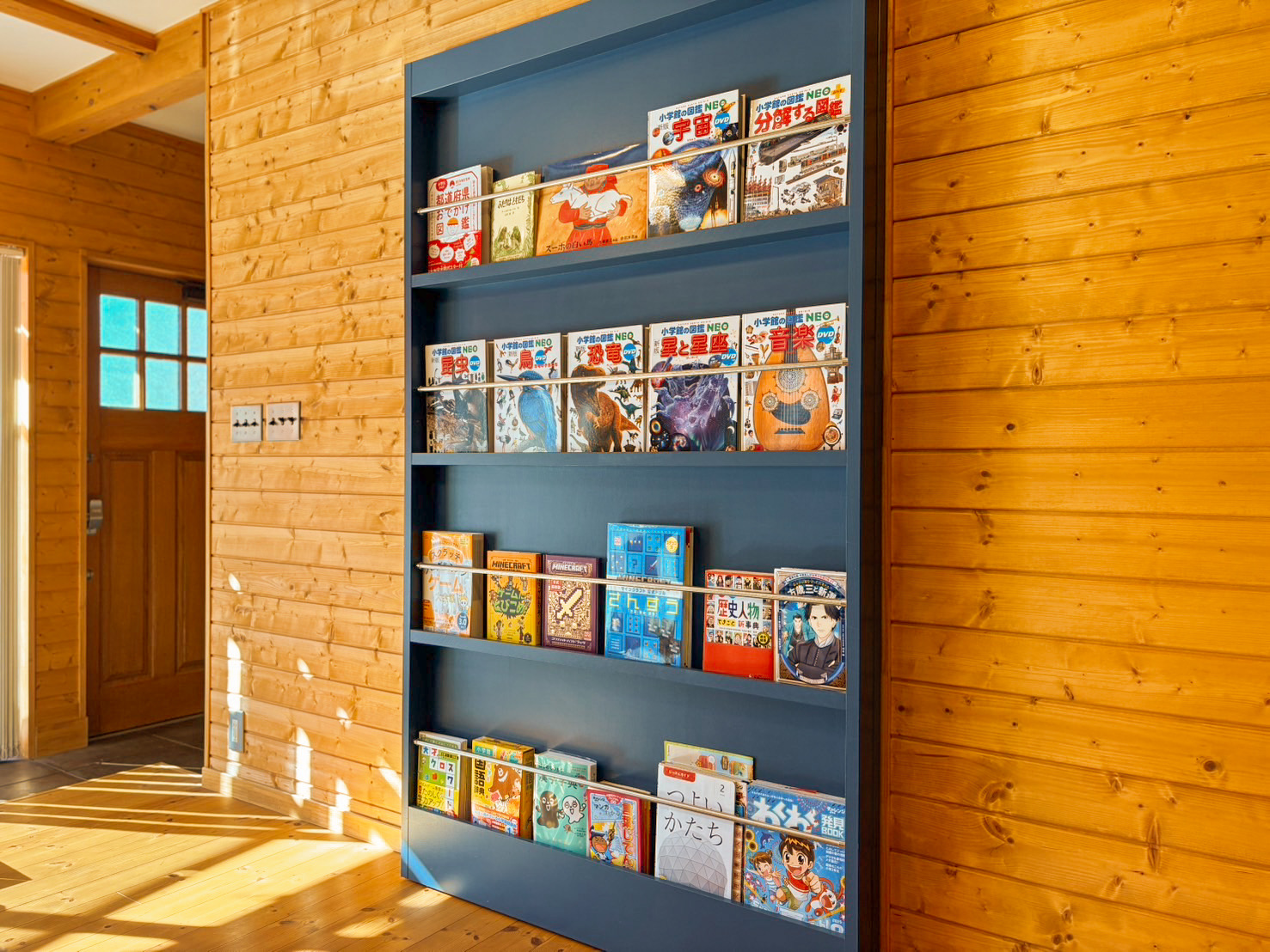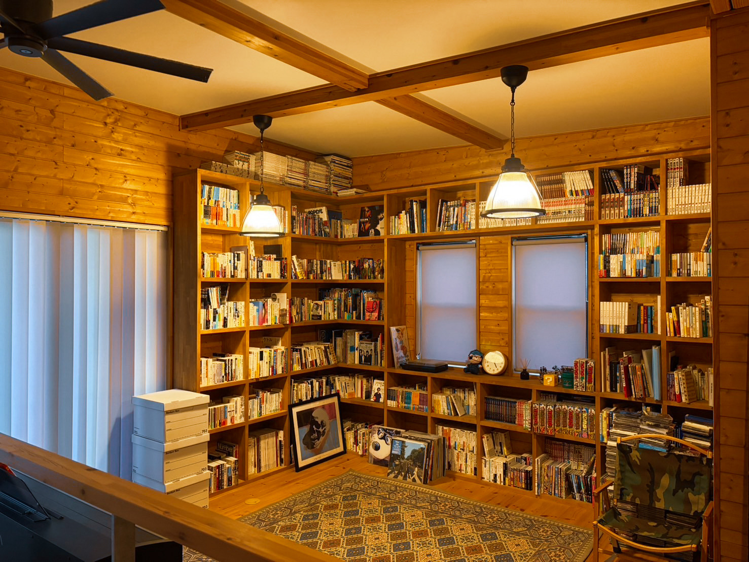 壁一面の本棚には、ご主人の好きな本とレコードがぎっしり。
